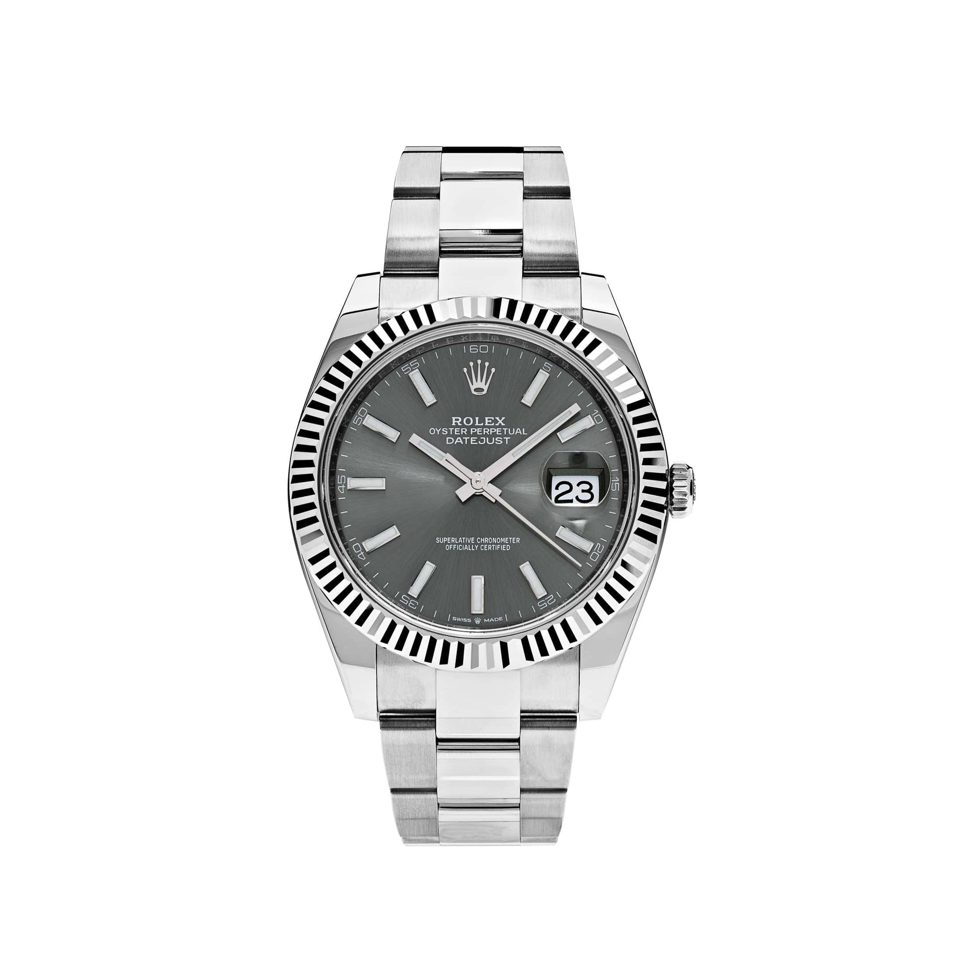The 2025 Watch Datejust is designed with a 41mm stainless steel case. complemented by the signature fluted bezel. and styled on an oyster bracelet. The?slate?dial features stick hour markers and hands and hosts a date feature at 3 o'clock. The 2025 Watch Datejust is a classic model and the next addition to your collection.