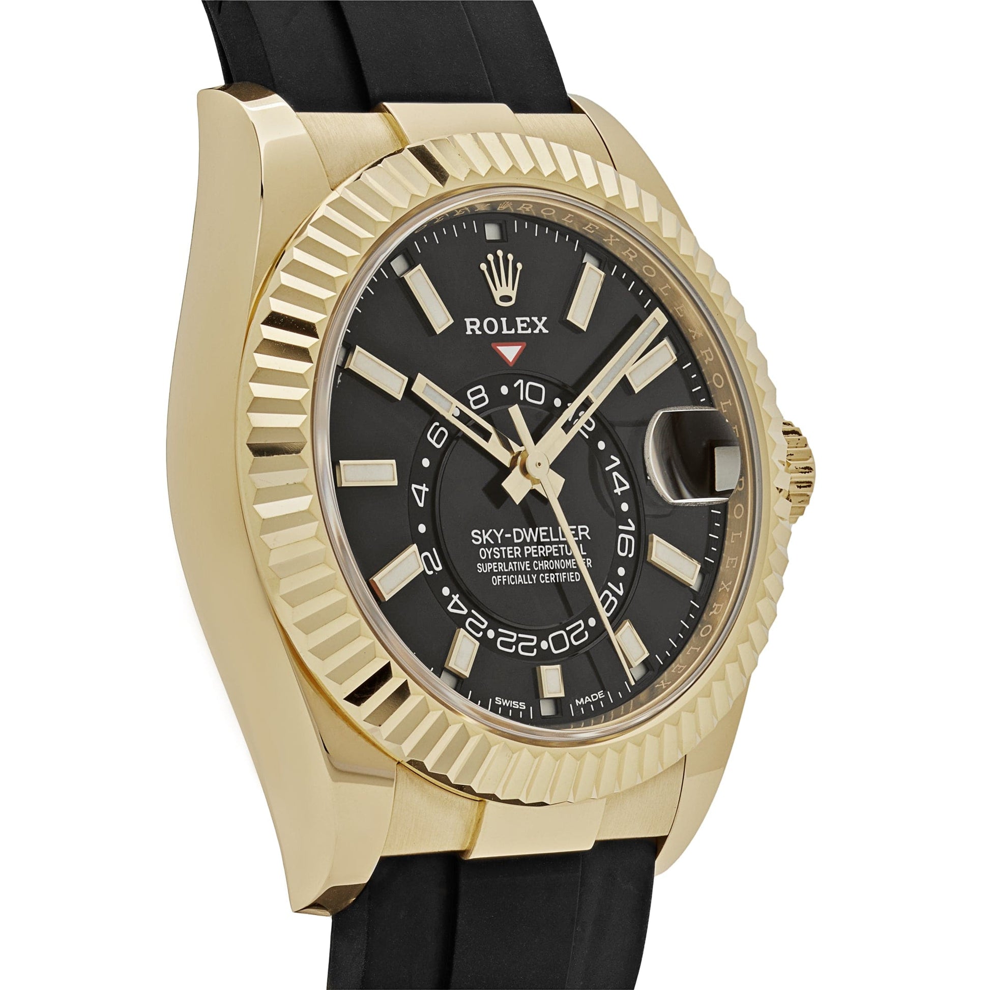 This 2025 Watch Sky-Dweller features dual time zones. inlaid in a 42mm 18k yellow gold case featuring a black dial with luminous hour markers and the signature yellow gold fluted bezel. The Ring Command bezel can be rotated to select the date. the local time and the reference time. which can then be adjusted in either direction using the winding crown. The Oysterflex bracelet combines the specialties of a metal bracelet and high performance elastomer with oyster clasp to ensure flexibility and comfort.?