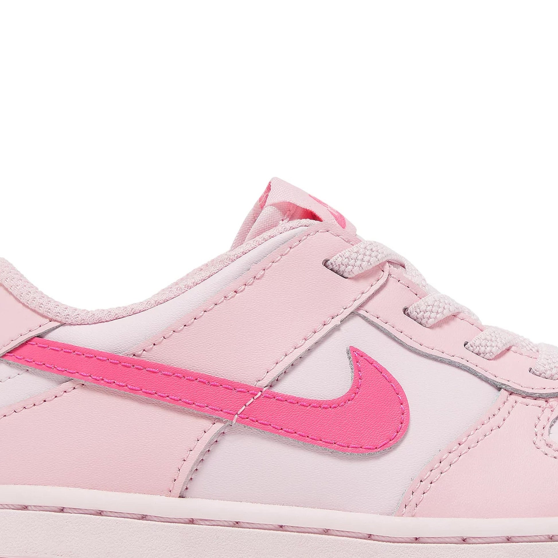 The New Dunk Low 'Triple Pink' TD is enveloped in a striking all-pink colorway that spans from the leather upper to the rubber outsole, creating a uniform and eye-catching appearance. The sneaker features a mix of soft and durable materials, including smooth leather overlays and a breathable mesh tongue, ensuring comfort and longevity for young wearers. The signature New Swoosh, also in pink, seamlessly blends into the design, maintaining the monochromatic theme while emphasizing brand identity. Padded collars and a cushioned midsole provide additional support and comfort, making this sneaker ideal for daily adventures.