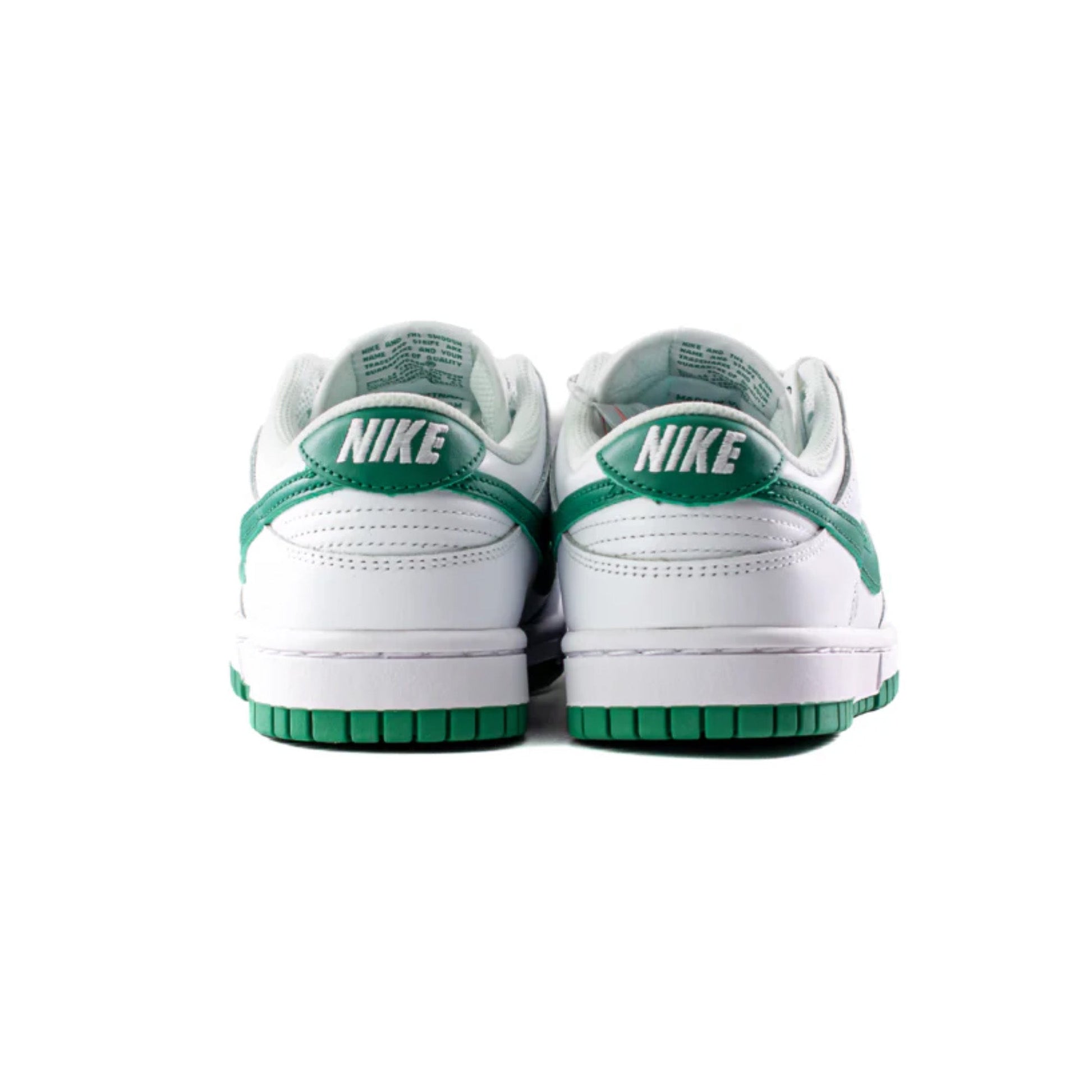 The New Dunk Low 'White Green Noise' Women's features a pristine "White" leather upper that sets the stage for the shoe's bold aesthetic. The "Green Noise" overlays provide a refreshing contrast, enveloping the forefoot, eyelets, and heel, which not only enhances the sneaker's visual appeal but also ensures durability. The iconic Swoosh, rendered in the same vibrant green, seamlessly integrates into the design, extending from the midfoot to the rear. The white midsole and green rubber outsole deliver both comfort and traction, making these sneakers perfect for everyday wear. Complementing the shoe's exterior, the green laces and tongue tag maintain the theme, while the cushioned collar and insole offer unparalleled comfort.