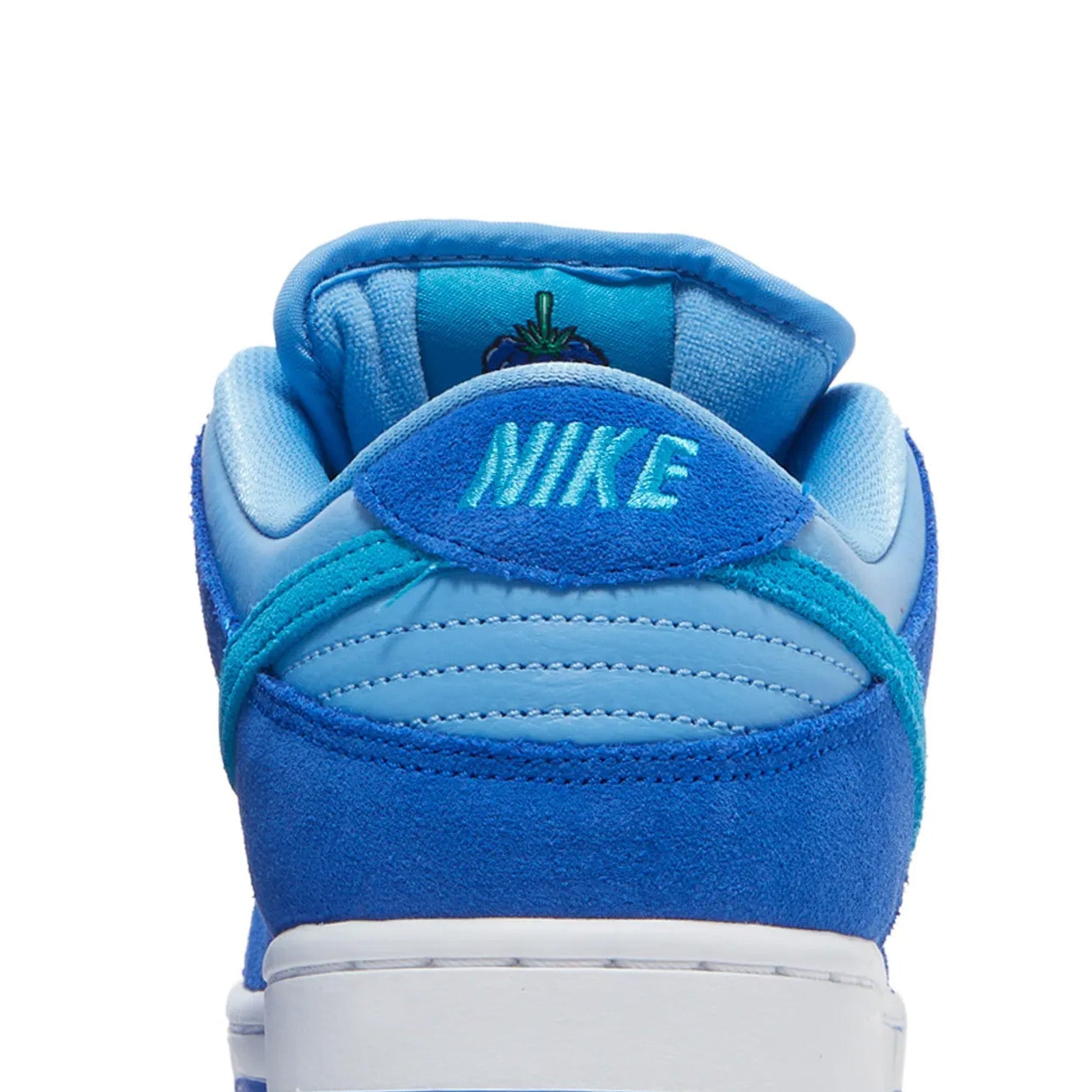 Buy the SB Dunk Low 'Blue Raspberry' (2022) As part of the 2022 New SB Fruit Pack, the New SB Dunk Low Blue Raspberry features a Laser Blue tumbled leather upper with Racer Blue suede overlays and University Blue Swooshes. On the inside face of the tongue, a woven label depicting a cartoon-style raspberry character adds a playful look to the silhouette. From there, a cushioned Zoom Air sole completes the design.